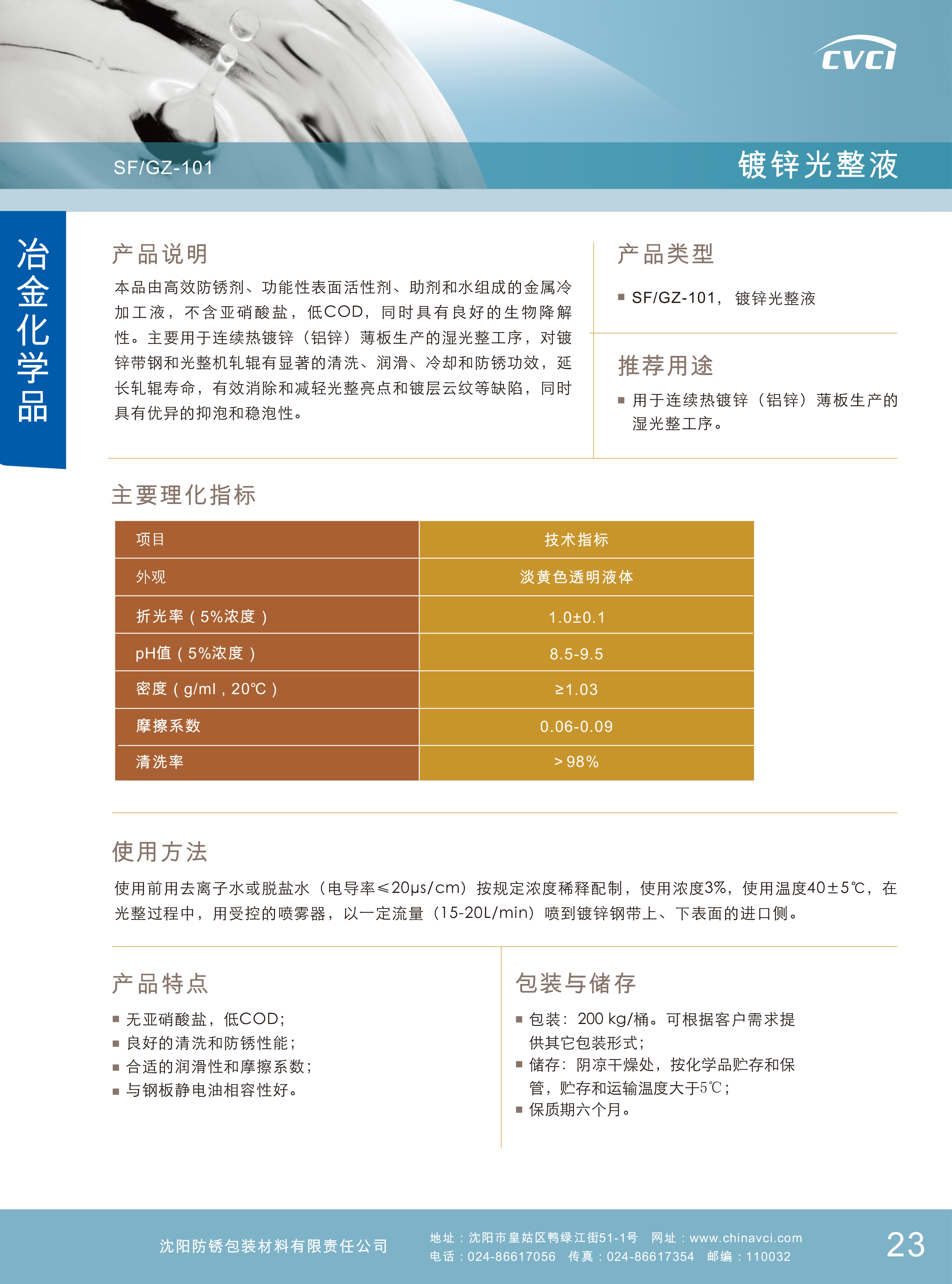 由高效防銹劑、功能性表面活性劑、助劑和水組成的金屬冷加工液,不含亞硝酸鹽,低COD,同時(shí)具有良好的生物降解性。主要用于連續(xù)熱鍍鋅(鋁鋅)薄板生產(chǎn)的濕光整工序,對鍍鋅帶鋼和光整機(jī)軋輥有顯著的清洗、潤滑、冷卻和防銹功效,延長軋輥壽命,有效消除和減輕光整亮點(diǎn)和鍍層云紋等缺陷,同時(shí)具有優(yōu)異的抑泡和穩(wěn)泡性。