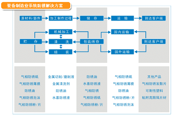 裝備制造業(yè)從原材料貯存,到加工制造、裝配、運(yùn)輸,每一個(gè)環(huán)節(jié)都會面臨銹蝕問題。該領(lǐng)域?qū)τ诜冷P產(chǎn)品具有需求范圍廣、個(gè)性化要求高、技術(shù)支持需求明顯等特點(diǎn)。我們按客戶材質(zhì)、工藝和儲運(yùn)要求,進(jìn)行系統(tǒng)的防銹防護(hù)解決方案。已成功完成小到微型電機(jī)、大至成套工程機(jī)械的防銹防護(hù)方案設(shè)計(jì)和多年驗(yàn)證工作。為我國裝備制造業(yè)發(fā)展保駕護(hù)航!